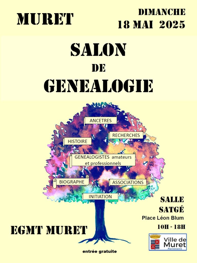 L’antenne de Muret de l’Entraide Généalogique du Midi Toulousain organise son deuxième Salon de Généalogie le dimanche 18 mai de 10h à 18h, salle Satgé, place Léon Blum, à Muret.