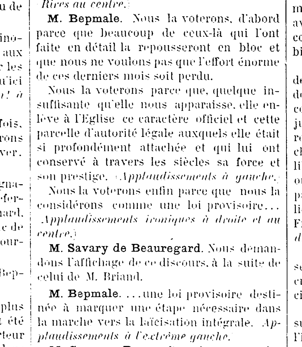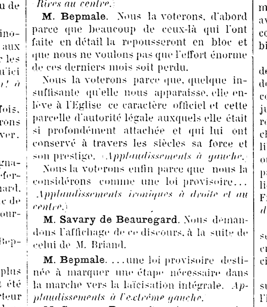 Député et Maire de Saint-Gaudens, avocat, fondateur du journal La Montagne le radical-socialiste Jean Bepmale a joué un rôle actif dans la préparation et l’adoption de cette loi. Il était vice-président de la commission parlementaire ad hoc qui a rédigé la proposition de loi et a animé les débats à l’Assemblée Nationale au printemps 1905.